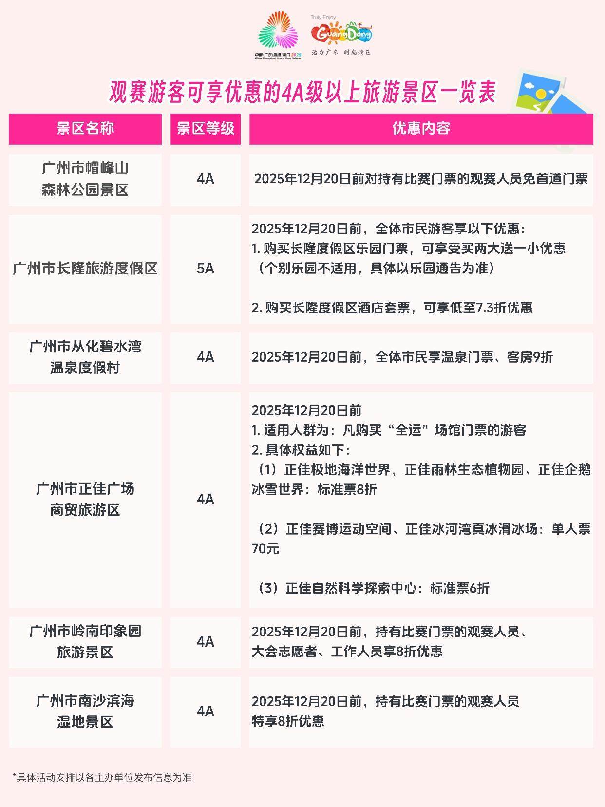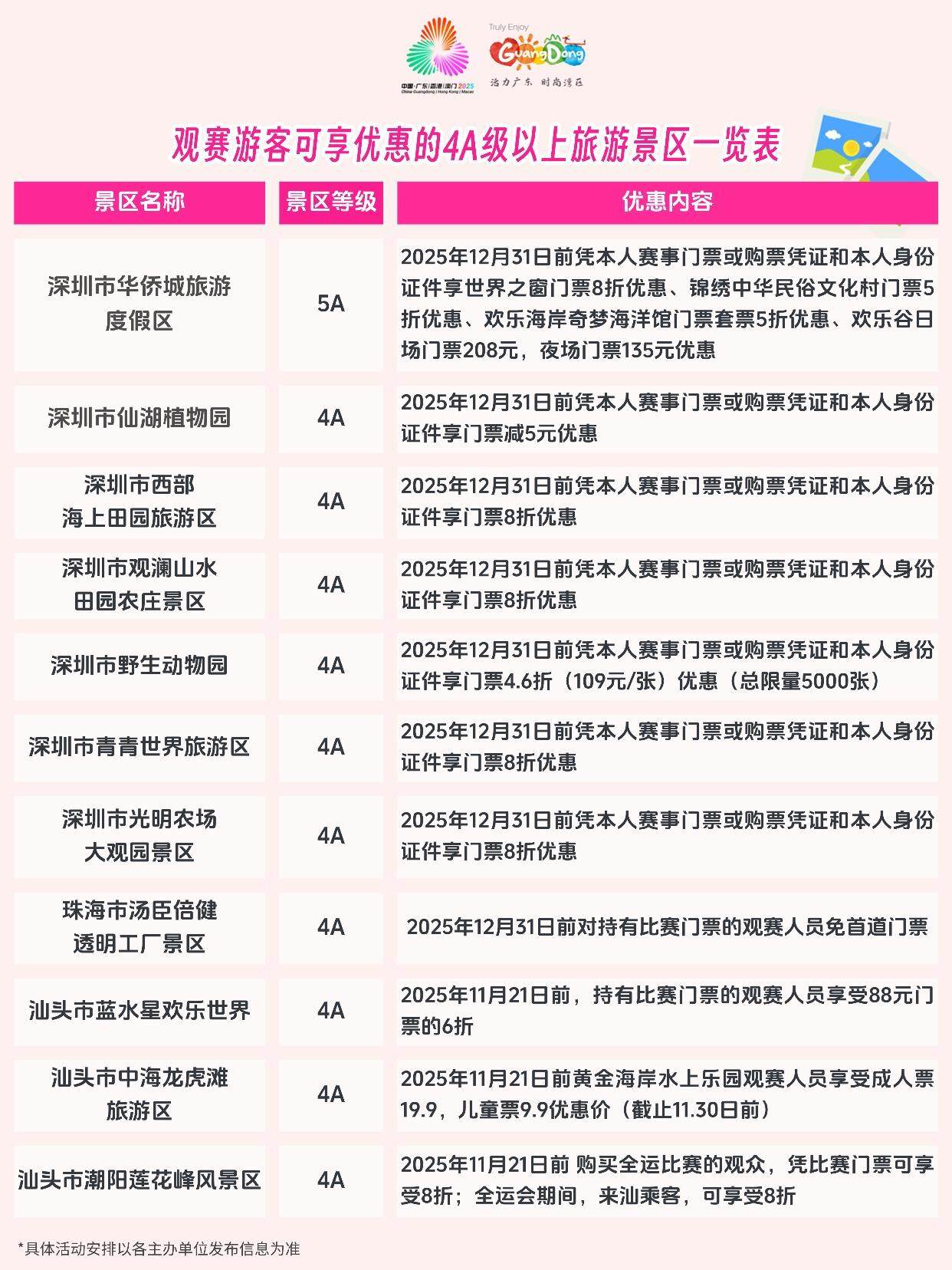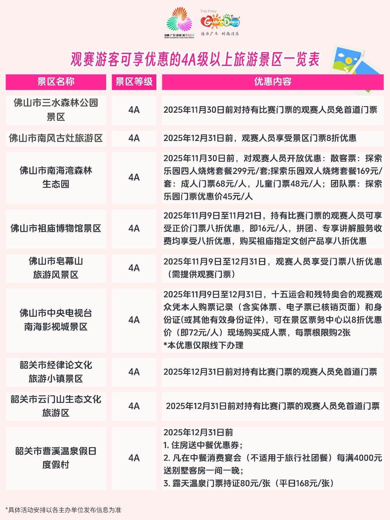 温馨提示:活动名单仅供参考,各景区在全运会期间对观赛人员和广大游客均有不同程度的优惠,具体优惠规则还请关注各个景区发布的公告。