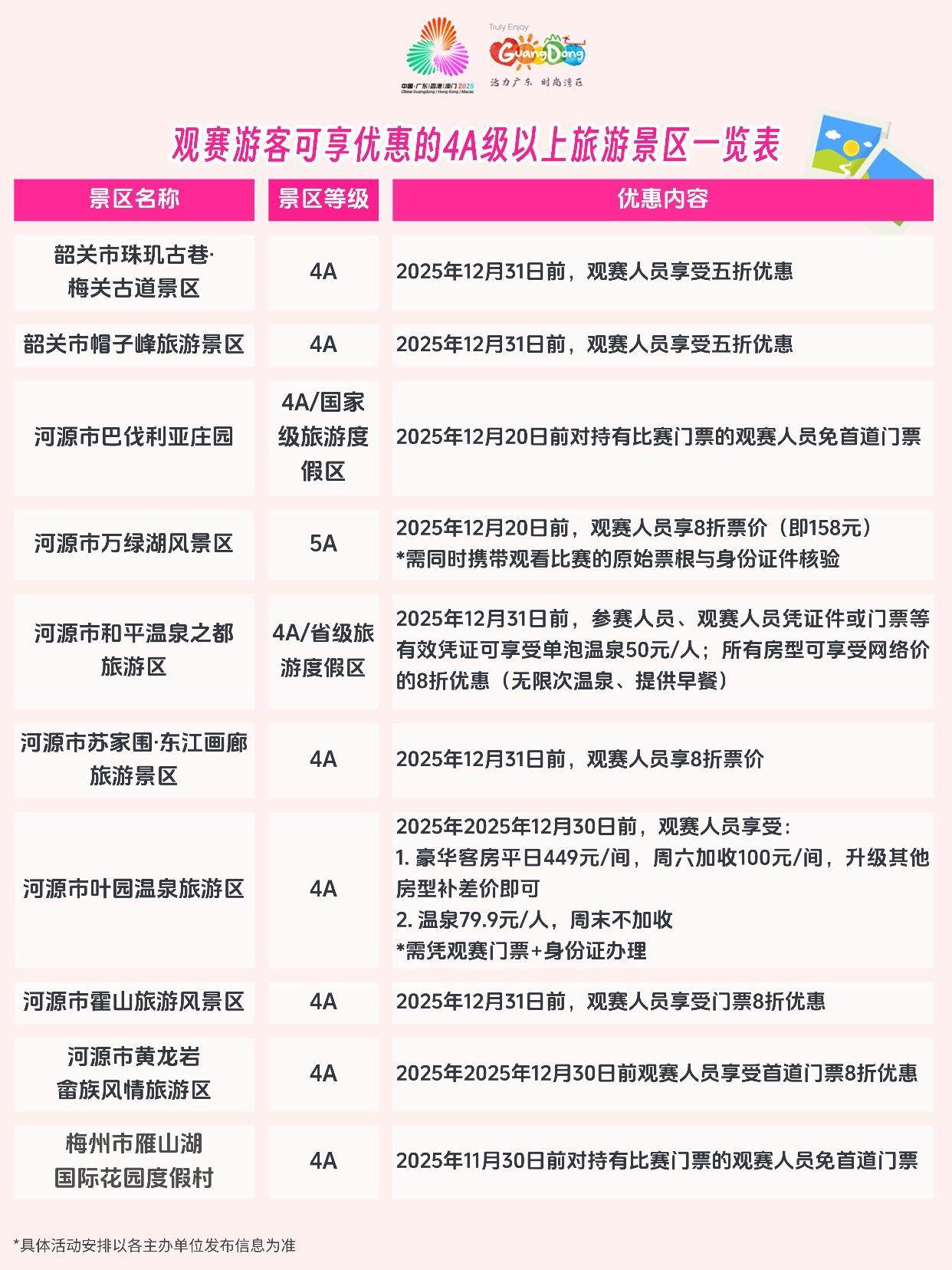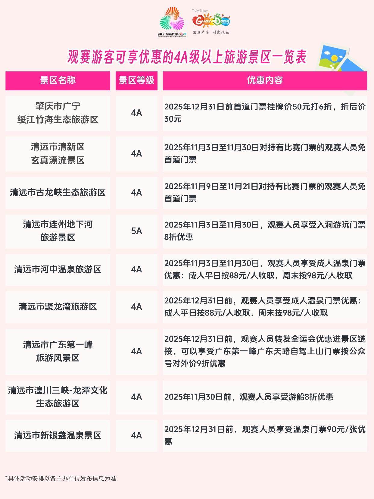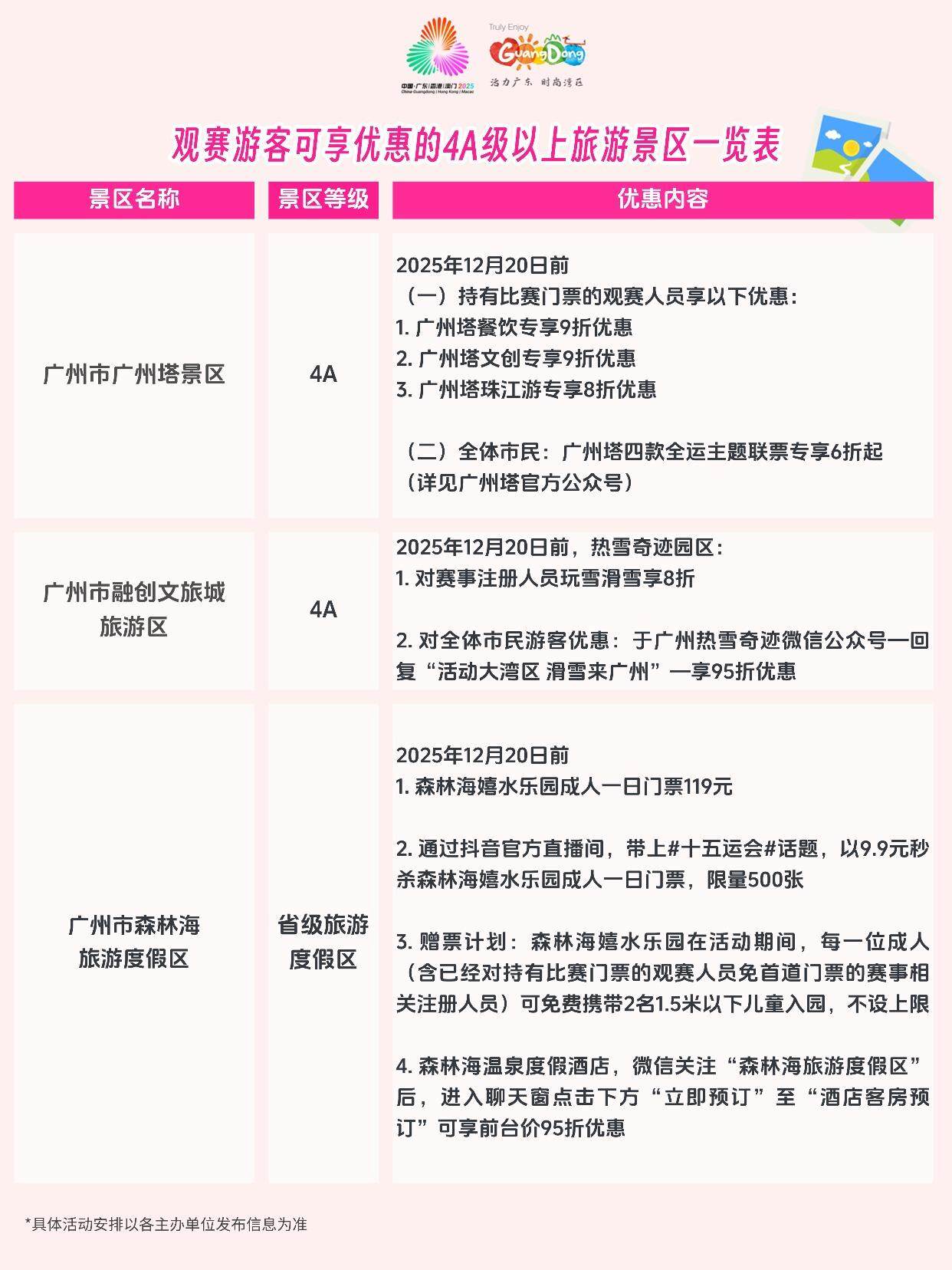 温馨提示:活动名单仅供参考,各景区在全运会期间对观赛人员和广大游客均有不同程度的优惠,具体优惠规则还请关注各个景区发布的公告。
