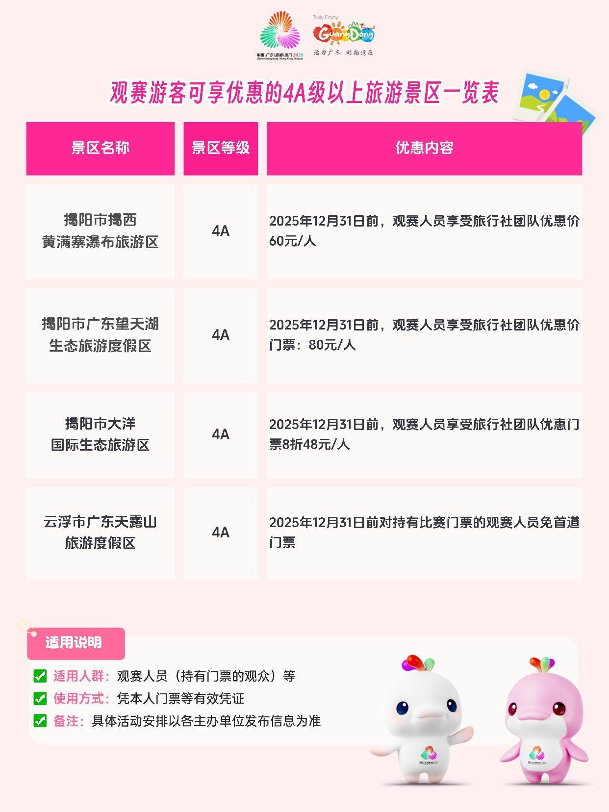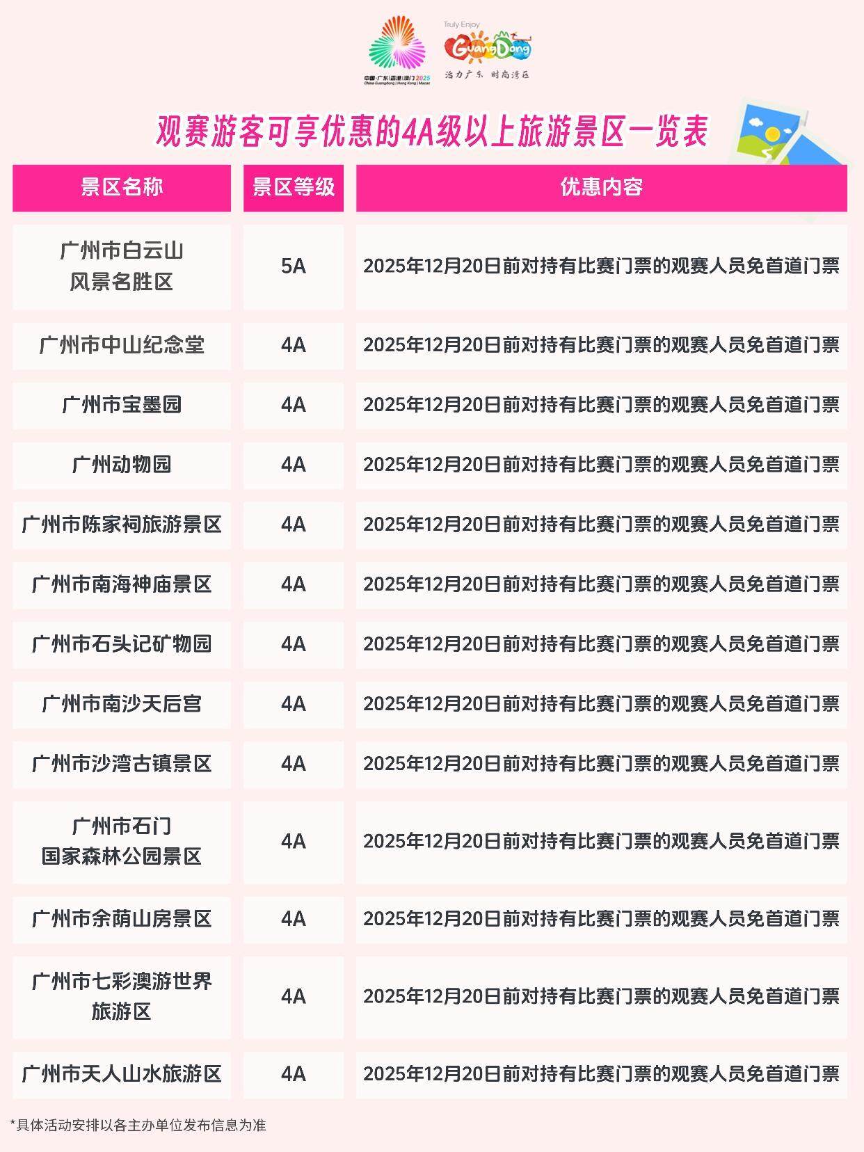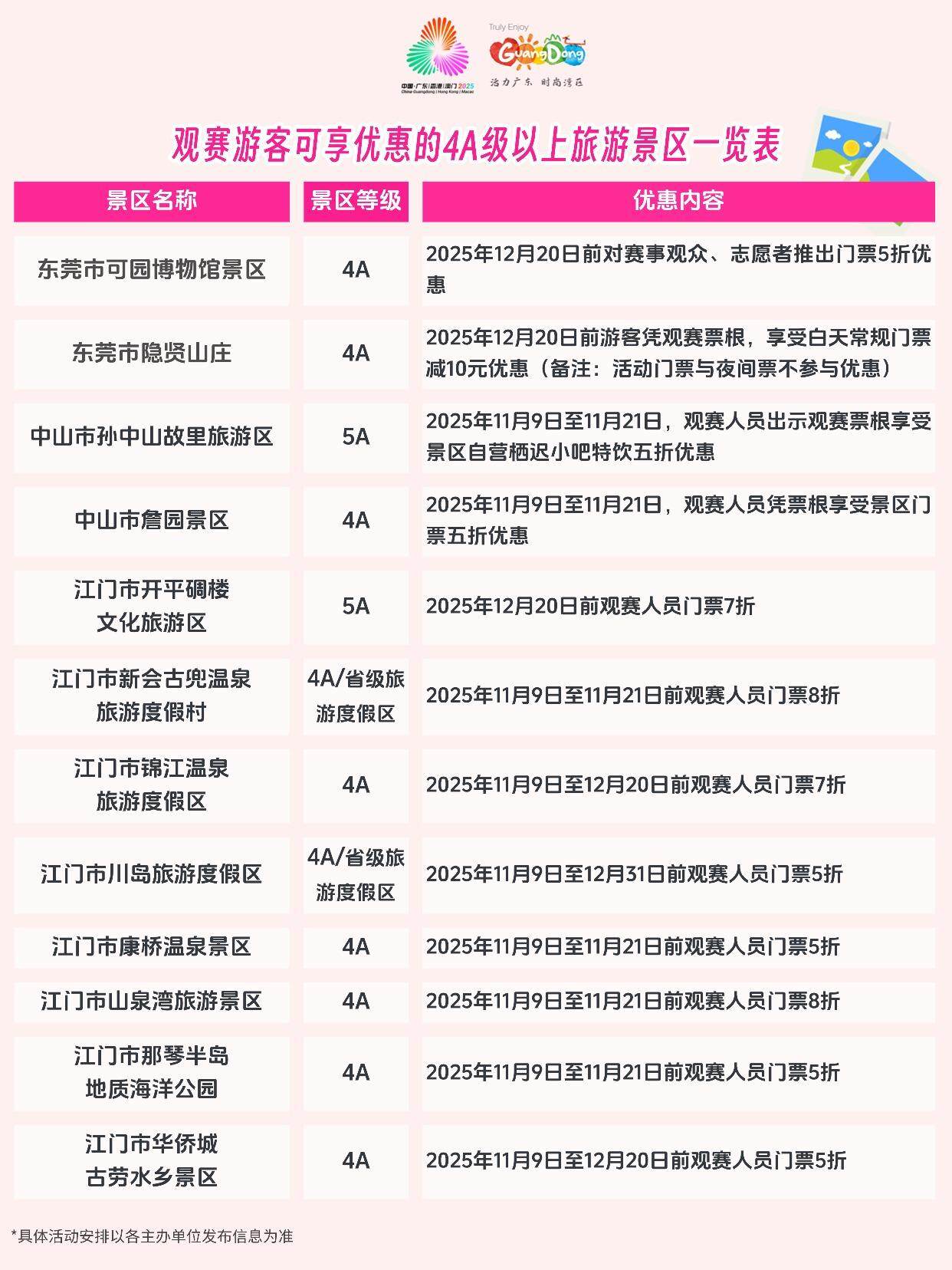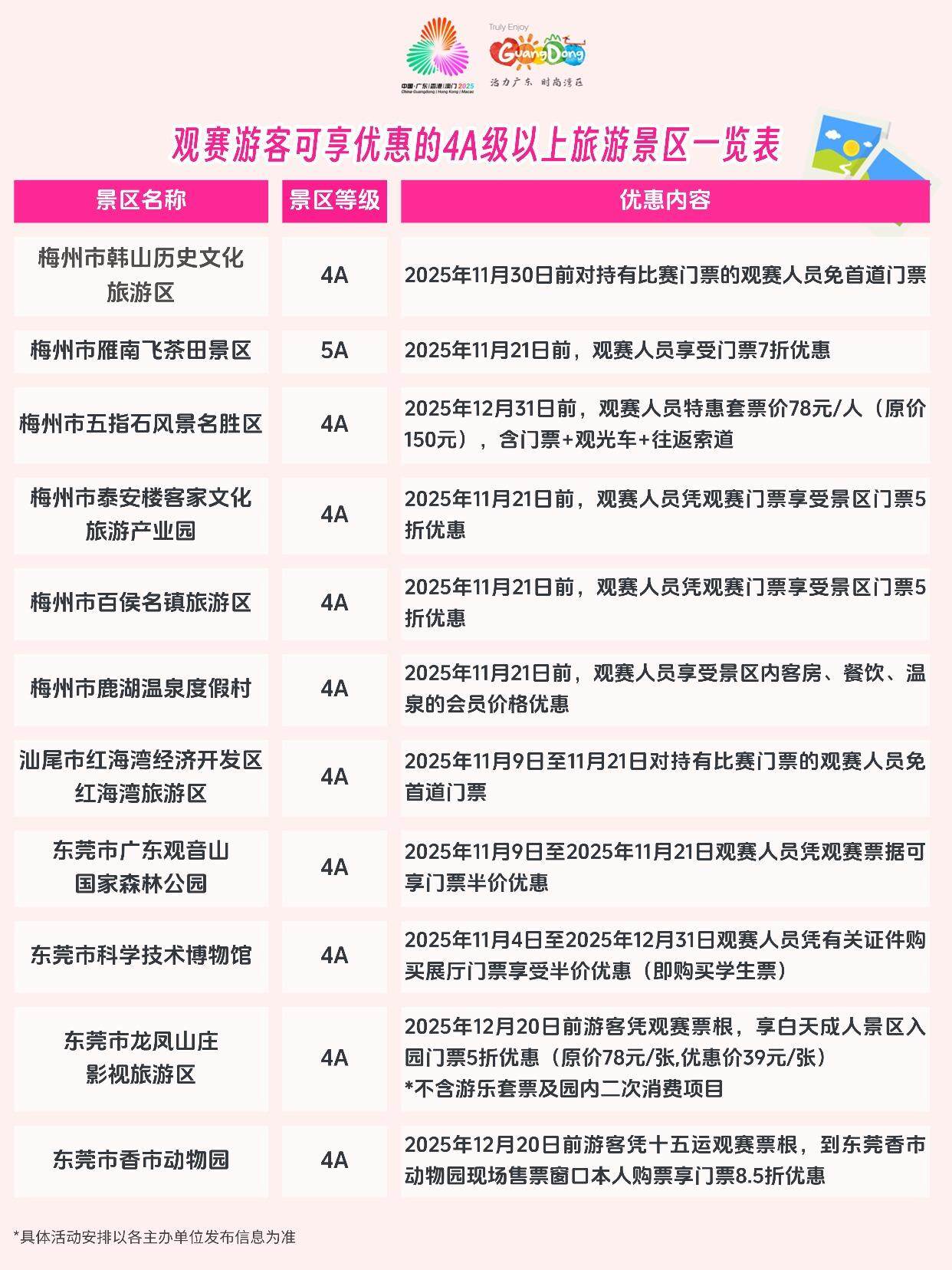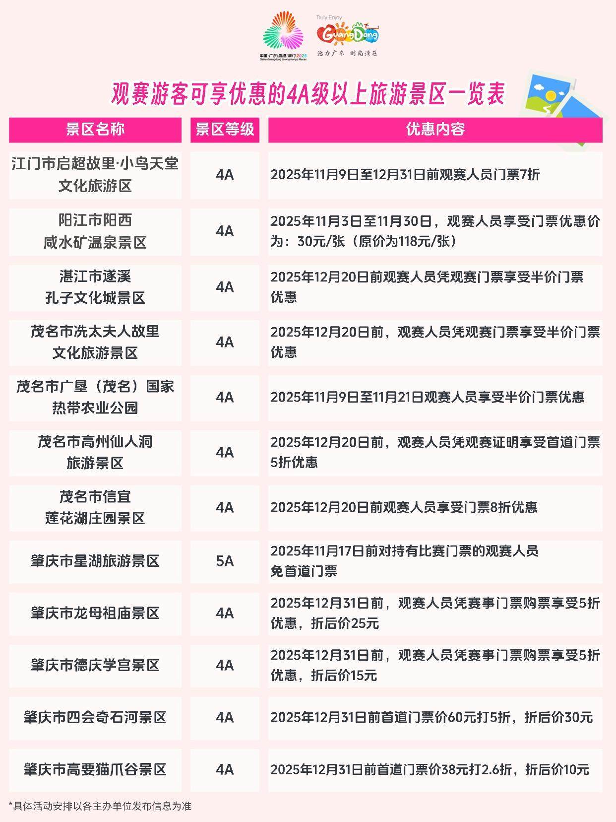 为营造“全民全运、共享盛事”的良好氛围,全省超过100家4A级以上旅游景区和省级以上旅游度假区同步面向观赛游客推出形式多样的游览优惠,包括门票折扣、联票套餐及特色体验活动,让广大观众在观赛之余,能够轻松畅游广东,深入感受岭南文化的独特魅力。
